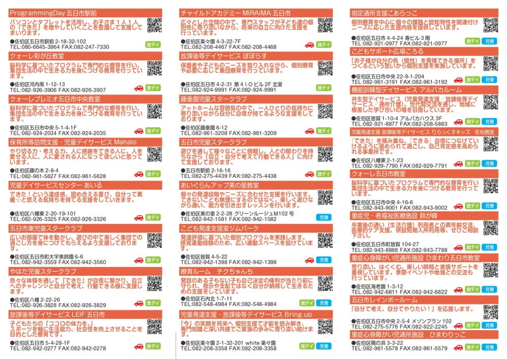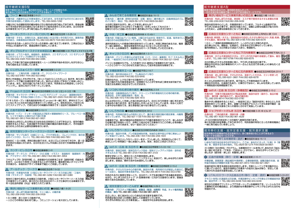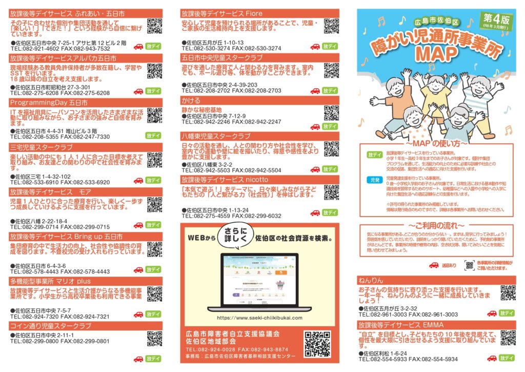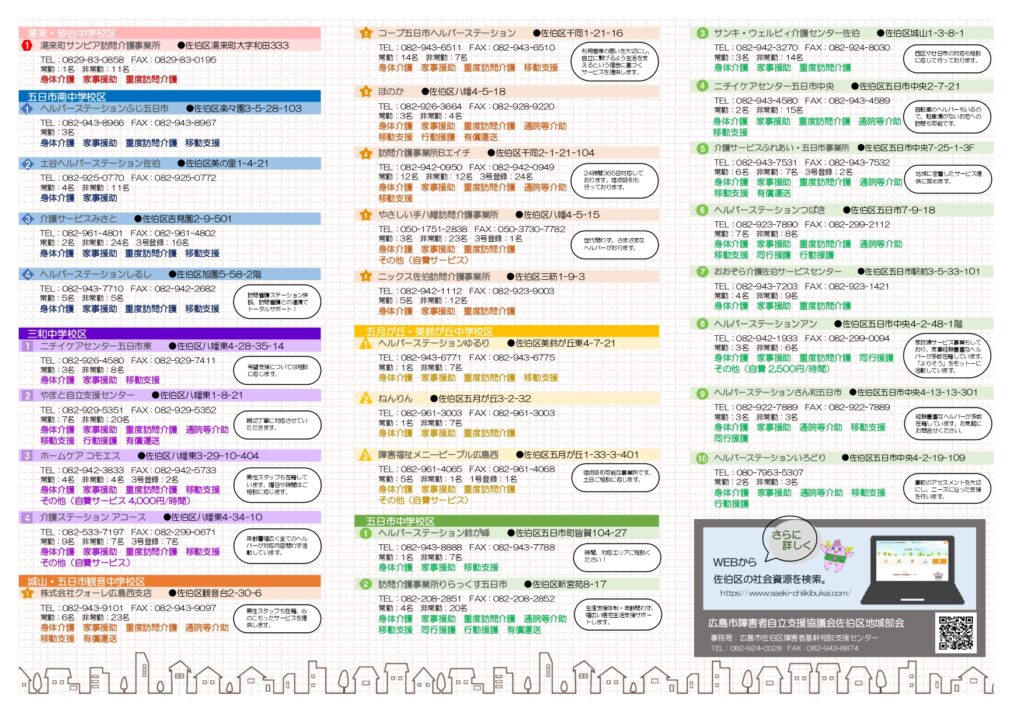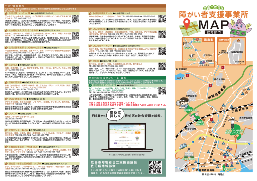 社会資源ガイド佐伯区内の障害福祉サービス 障害のある方のニーズにお応えするための様々な支援を「社会資源」といいます。 佐伯区内にある社会資源をご紹介いたします。 ヘルパー すごす とまる はたらく くらす こども そうだん マップ 広島市佐伯区障がい支援事業所 訪問介護事業所MAP 広島市佐伯区障がい支援事業所 訪問介護事業所MAP(PDF) 広島市佐伯区障がい者支援事業所 就労部門MAP 広島市佐伯区障がい者支援事業所 就労部門MAP(PDF) 広島市佐伯区障がい児通所支援事業所MAP 広島市佐伯区障がい児通所支援事業所MAP(PDF)